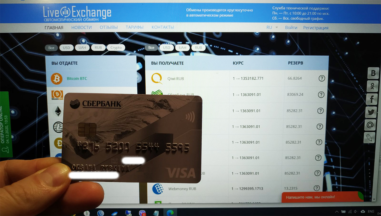 — Нужно сделать фотографию Вашей карты, на фоне страницы нашего сайта, открытая страница должна быть видна полностью, должен быть виден логотип обменника. На фото должна быть видна рука держащего карту. Карта на фото не должна быть обрезана. На фотографии карты должно быть видно все цифры карты, а также ФИО владельца. Остальные данные можно закрыть. Фото категорически запрещено обрабатывать графическим редактором.